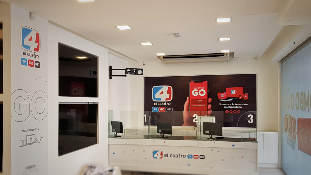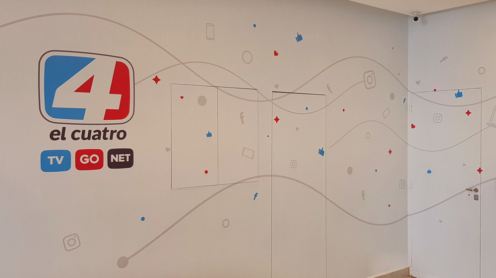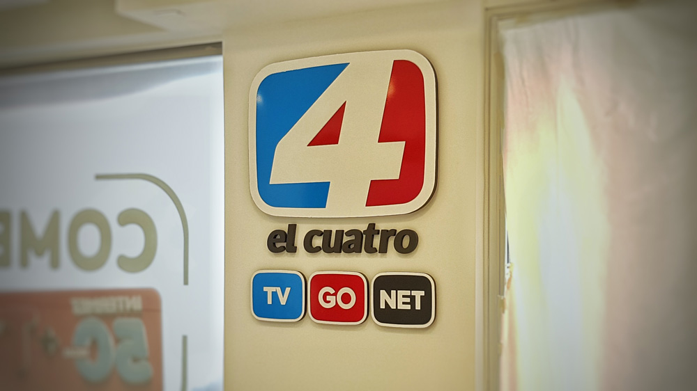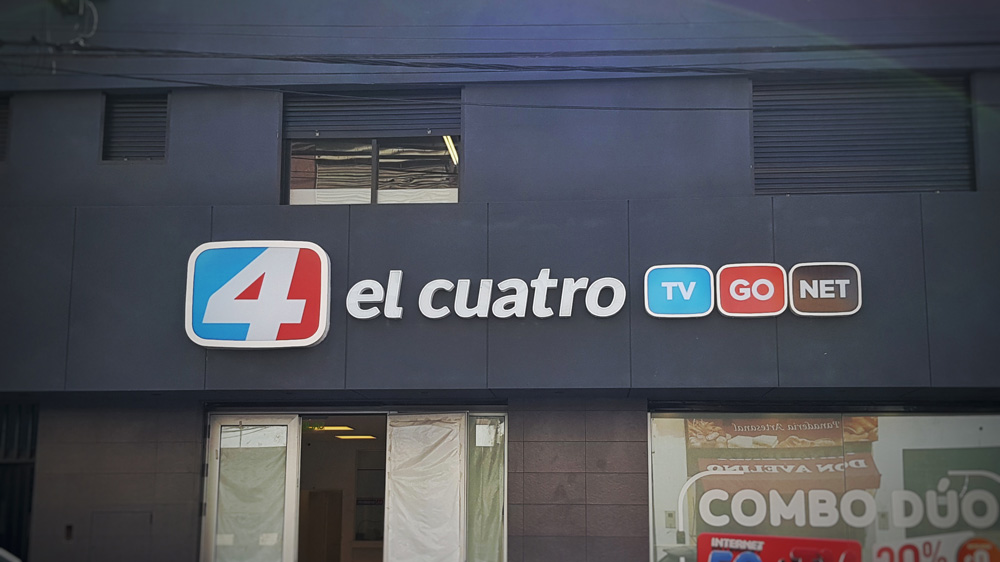 Para las nuevas oficinas de El Cuatro, instalamos un corporeo en chapa galvanizada, con frente en acrilico.