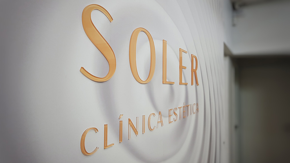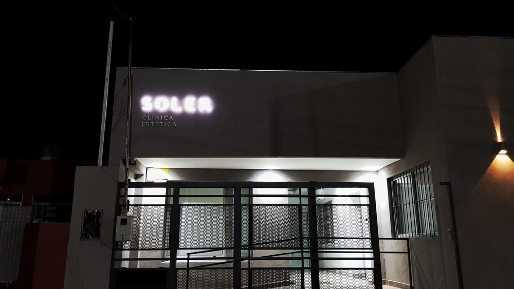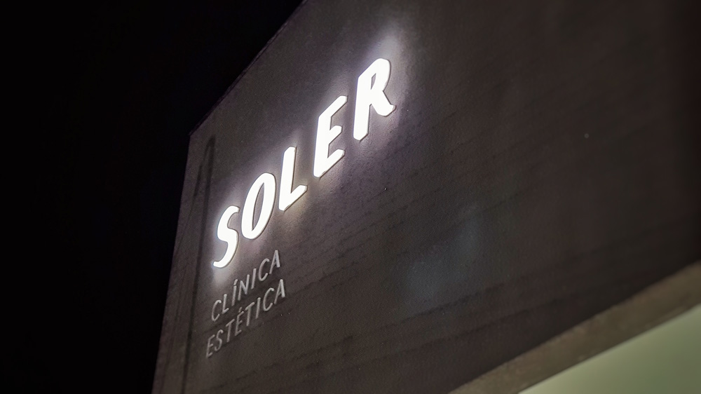 En la clínica estética Soler, en el frente, instalamos un corpóreo realizado en acrílico blanco de 2mm termoformado con iluminación LED. Las letras más pequeñas fueron realizadas en acrílico blanco de 6mm.